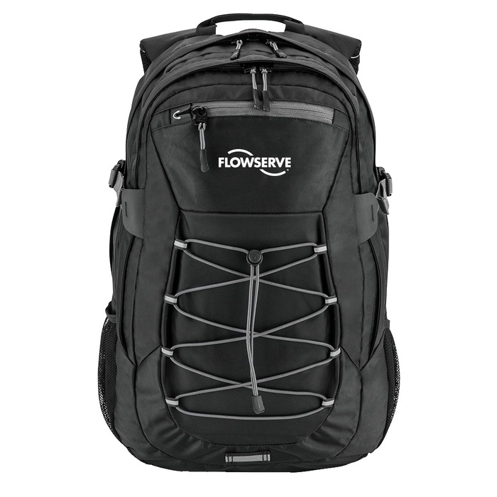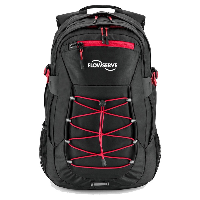 Designed with two large zip compartments; the back compartment includes padded laptop and tablet sleeve with notch to feed through hydration tube or headphones. Front section features internal organization pockets. Easy access zip-front pocket for phone or glasses and two external water bottle pockets. External bungee cords for stowing additional gear or layers, side cinch straps for easy compression, and sternum strap with hydration system support. Air Mesh Padded Straps and cushioned back panel with spine channel for comfort. Reflective front detailing for safety. Made with durable 420d material for long wear. Fits most 15"-17" laptops. Decoration for full color and one location.